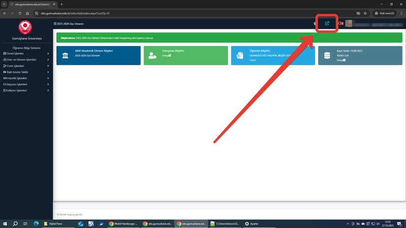 Ders bilgi sistemine girişler artık obs.gumushane.edu.tr adresinden gireceğiniz öğrenci ve akademisyen otomasyonunda yer alan aşağıdaki ekran görüntüsünde belirtilen bağlantı ile yapılacaktır. Eski giriş yöntemi olan kullanıcı adı ve şifre ile girişler kaldırılmıştır. Bilginize.